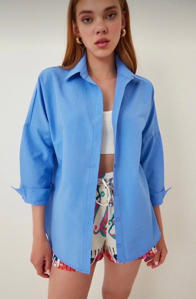 Pamuklu kumaştan üretilmiş, uzun kollu, düğmeli, bol kesim ve kısa boyda pastel mavi bağcıklı V yakalı kadın gömlek. Günlük sokak stili için uygundur.