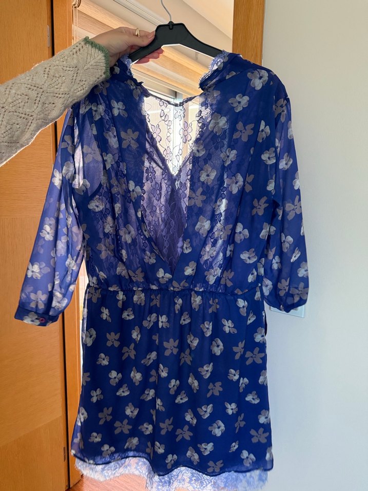 Uzun kollu, bol kesim, parlak mavi renkli bağlama desenli bohem mini elbise, dantel detaylarıyla tamamlanmıştır. L bedene uygun
