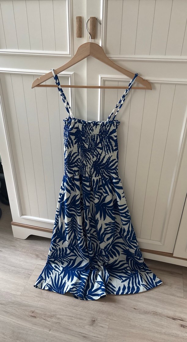 Mavi bağlama desenli, askılı, straplez yaka bohem midi elbise, bol kesim ve drapeli tasarım, yumuşak sentetik kumaştan üretilmiştir.