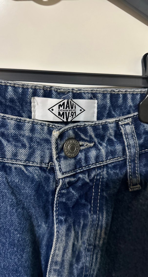 Mavi ve gri bağlama desenli, düğmeli kot pantolon. Rahat kesim ve normal midi boyuyla günlük kullanıma uygundur.