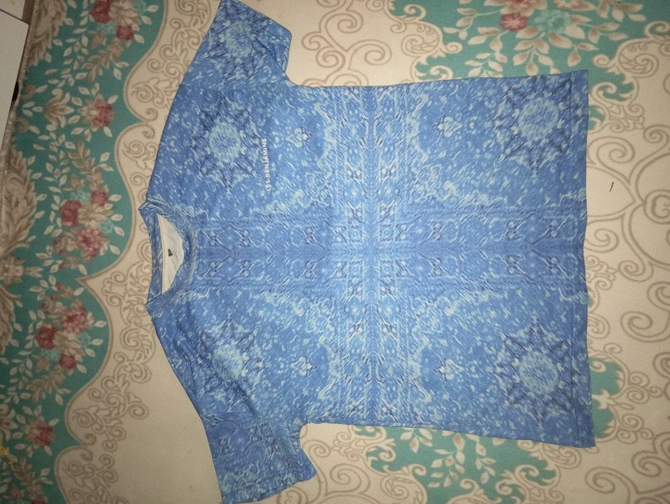 Erkekler için kısa kollu, yuvarlak yakalı, bol kesim mavi bağlama desenli tişört. Örme dokulu ve bohem tarzda, günlük kullanıma uygun.