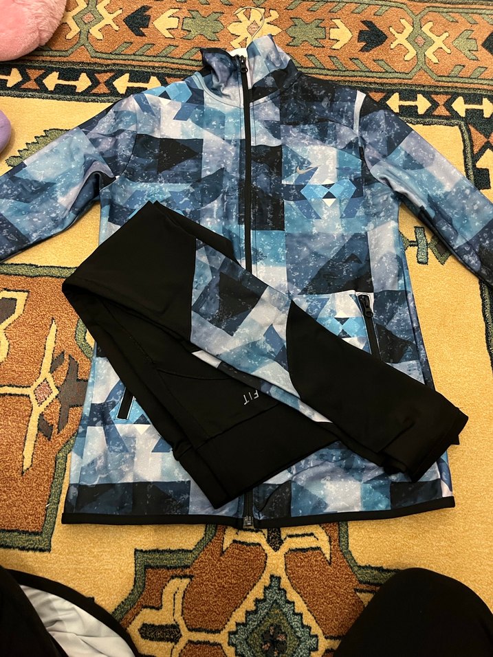 Fermuarlı, yüksek yakalı, mavi bağlama desenli, sentetik kumaştan yapılmış kesim eşofman takımı. ️