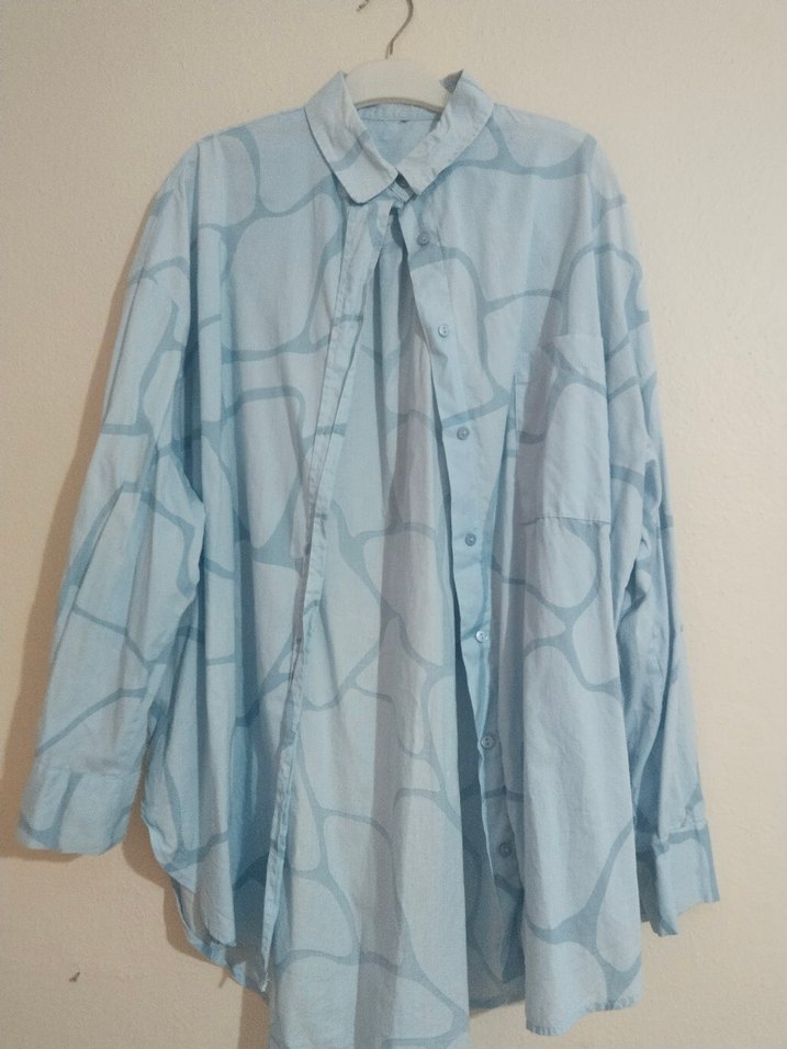 Mavi k gömlek, düğmeli ve yakalıdır. Uzun kollu, bol kesimve , gündelik rahat stil için uygundur.