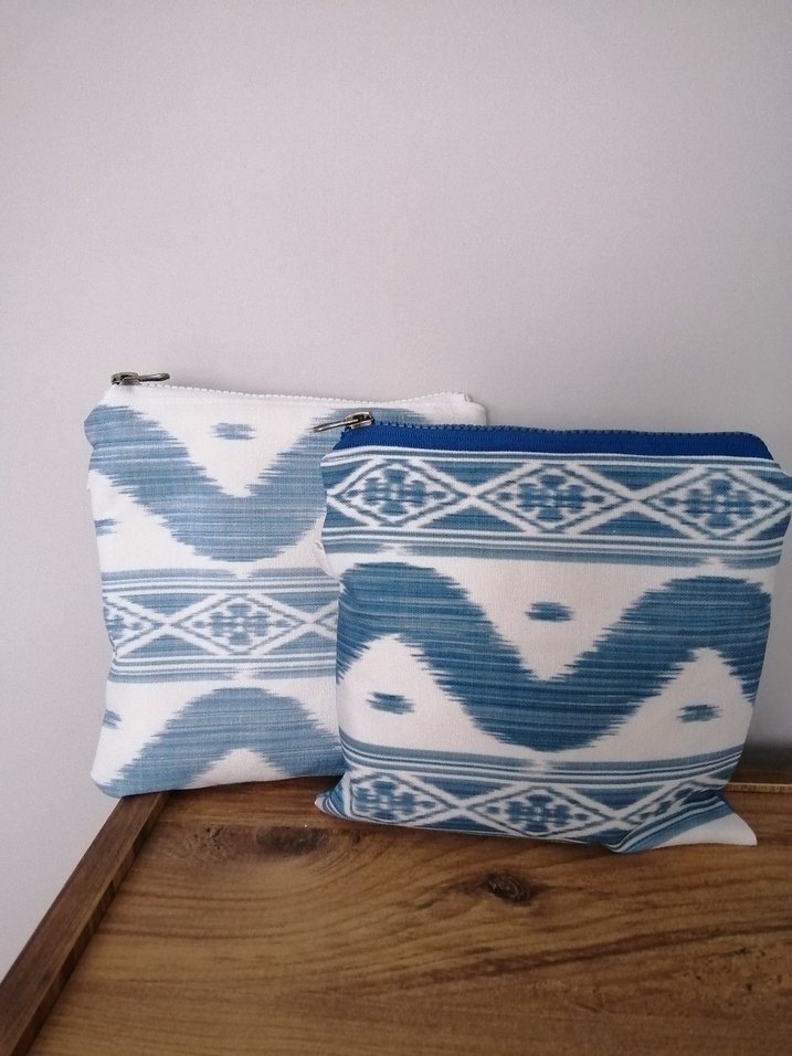 Sentetik kumaştan yapılmış, mavi bağlama desenli, fermuarlı, renkli ve minimalist bohem tarzda kadın makyaj çantası.
