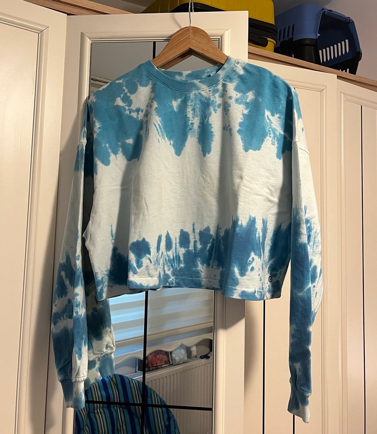 Pastel mavi bağlama desenli, yuvarlak yakalı, bol kesim kadın sweatshirt. Örgü dokuma tekstilden, günlük rahat sokak stili için uygundur.