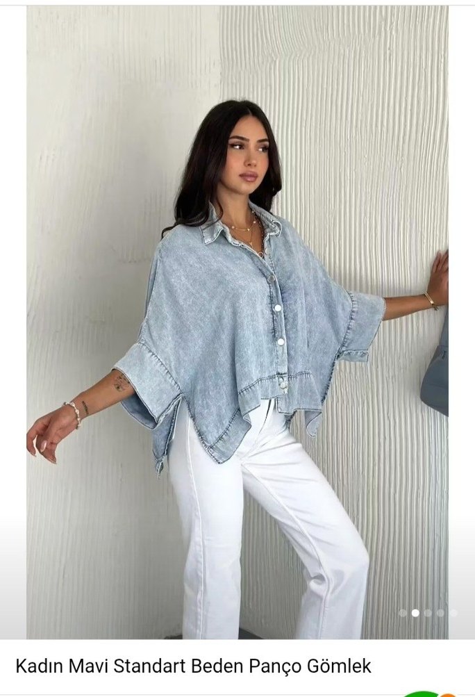 Bol kesim, kısa kollu denim gömlek. Tekne yakalı ve düğmeli, açık mavi bağlama desenli, günlük rahat kullanıma uygun.