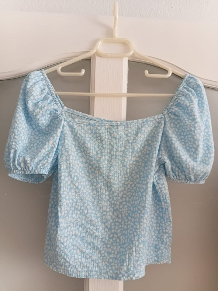 Yumuşak keten kumaştan, bağlama desenli pastel mavi, kısa kollu ve düğmeli, bol kesim tekne yaka bluz. Bohem tarz için uygundur.