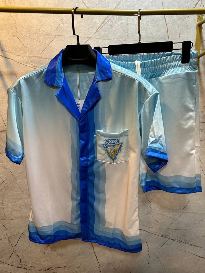Erkekler için bol kesim, kısa kollu, V yakalı takım. Pastel mavi bağlama desenli ve düğmeli, rahat sokak stili uyumu sağlar. ️