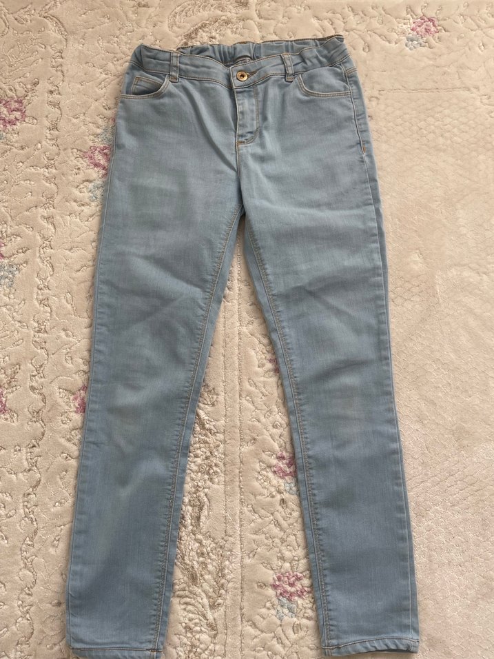 Mavi kot kumaştan yapılmış, düğmeli ve bağlama desenli kız çocuk pantolonu, rahat kesimle sunulmaktadır.