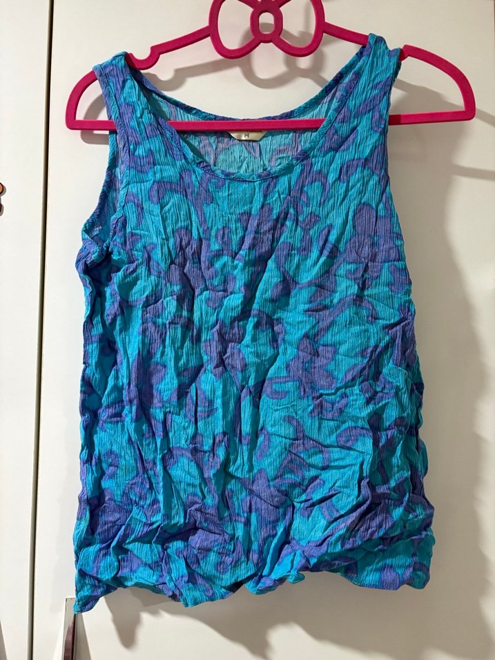 Mavi Bağlama Desenli Kolsuz Keten Bluz