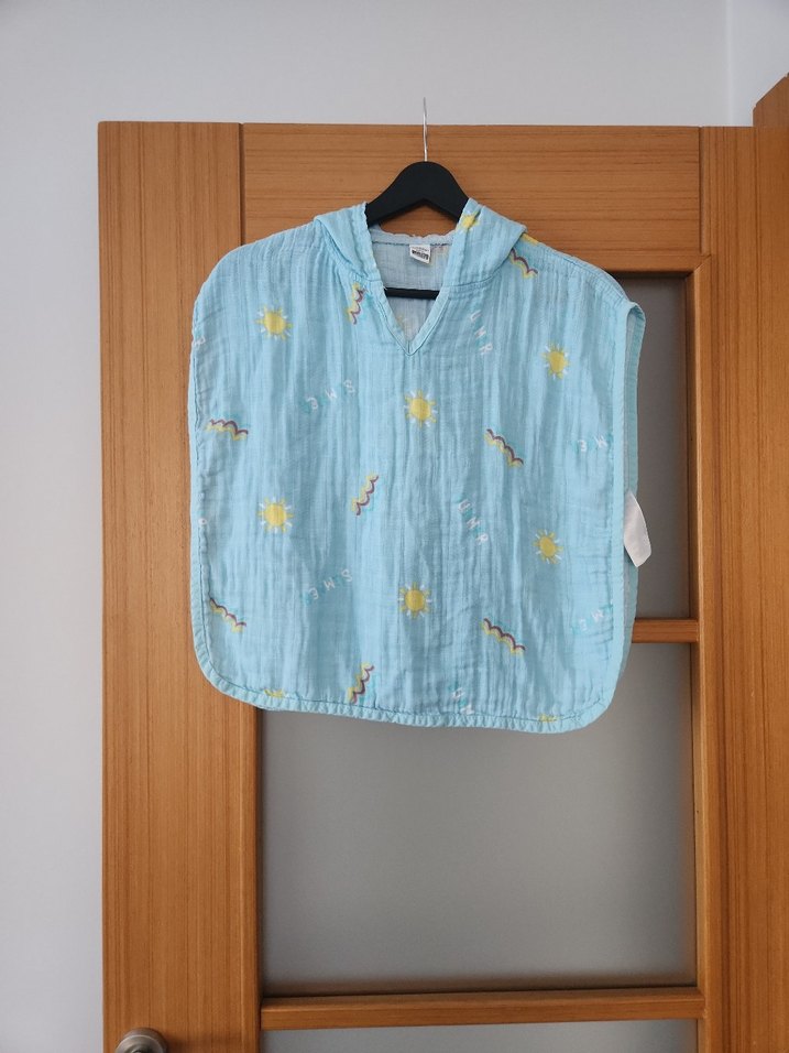 Kolsuz, bol kesim mavi panço, bağlama desenli ve düğmeli ön. Yumuşak keten kumaştan, askısız yakalı, bohem tarz için uygun. 1-2yaş