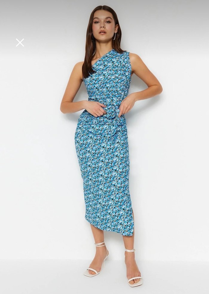 Drapeli detaylara sahip, mavi bağlama desenli uzun elbise. Sentetik kumaştan, bohem tarzda ve günlük kullanıma uygun.