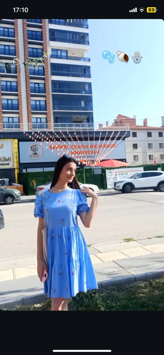 Bol kesim, kısa kollu, crew yaka, mavi pastel tonlarında bağlama desenli denim midi elbise, günlük sokak stili için uygun.