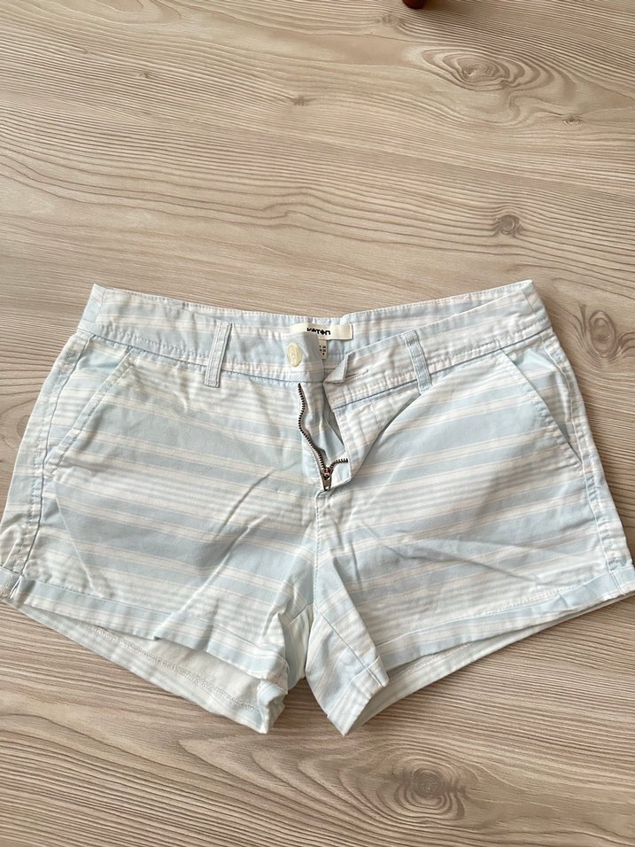 Düğmeli ön kısmı ve bağlama desenli, pamuklu mavi pastel tonlarda, sıkı kesim mini şort. Plaj ve sokak stili için uygun.