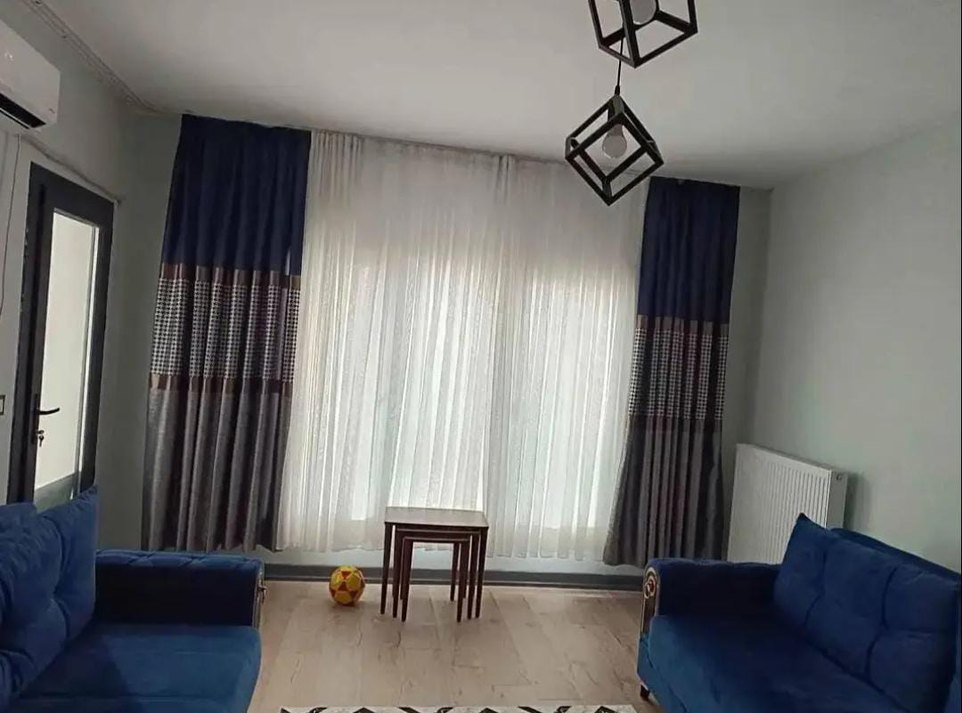 Mavi bağlama desenli ve gri detaylı modern perde, odanıza şık bir dokunuş katar. 2 li fon perde