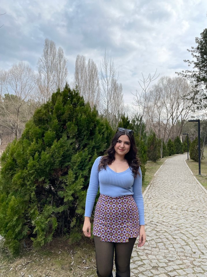 Pastel mavi bağlama desenli, örgü kumaştan yapılmış, normal boy fitted mini etek, dış mekan kullanımı için uygundur.