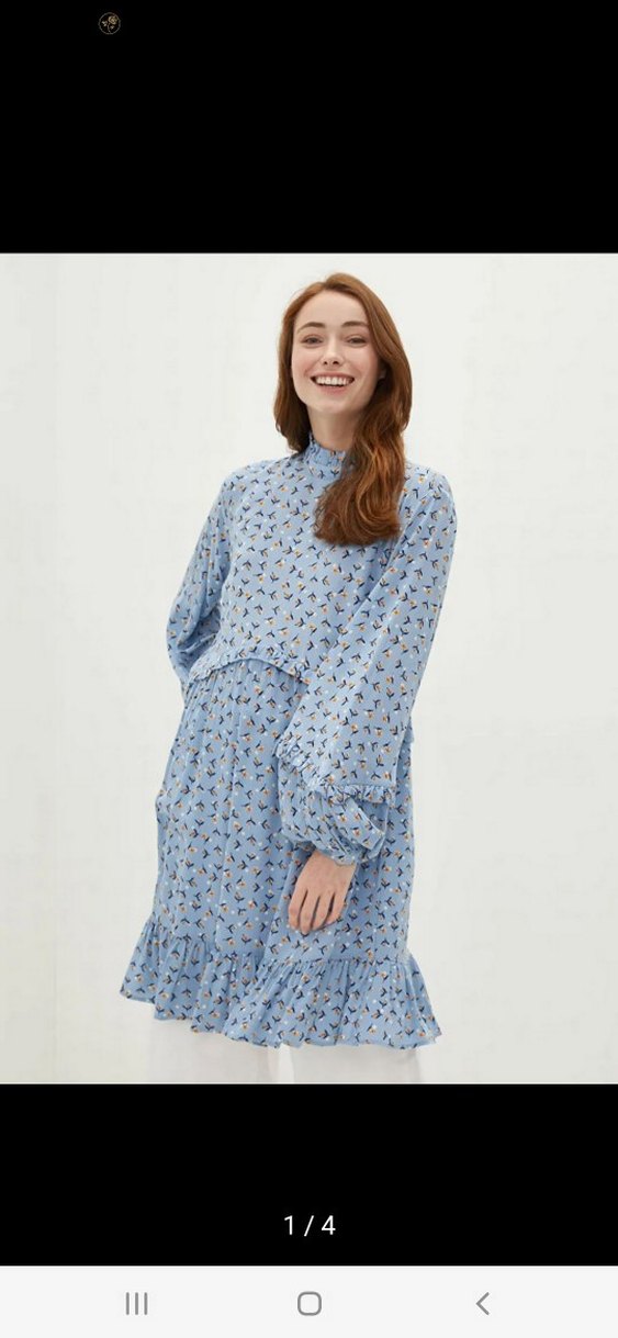 Bol kesim, yüksek yakalı ve uzun kollu midi tunik, pastel mavi bağlama desenli ve fırfır detaylı. Günlük kullanım için yumuşak pamuktan üretilmiştir.