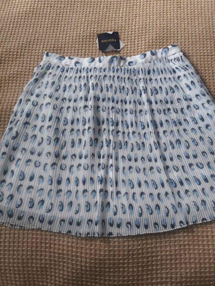 Mavi bağlama desenli pileli mini etek, bol kesimi ve rahat dokusuyla bohem tarzı için uygundur. Tekstil kumaştan üretilmiştir, açık hava etkinliklerine idealdir.