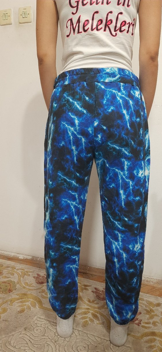 Rahat kesimli, canlı mavi bağlama desenli kadın pantolonu. Yumuşak sentetik kumaştan, elastik bel bantlı ve midi boyda, dış mekan için uygundur.