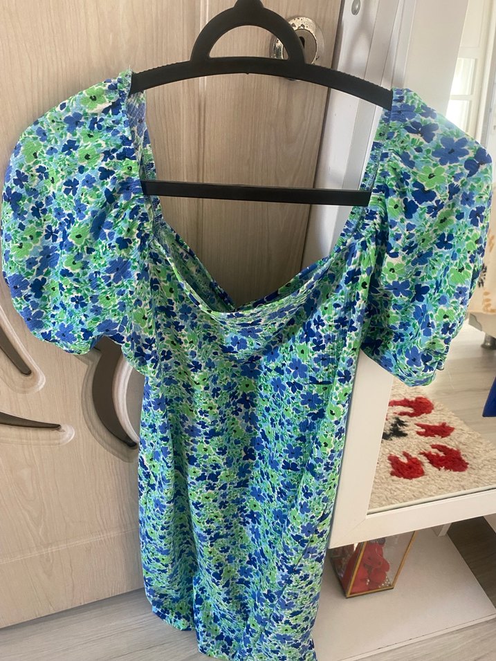 Bohem tarzda, straplez yakalı ve drapeli, renkli bağlama desenli elbise. Kısa kollu, bol kesim ve midi boyda, sentetik kumaştan yapılmıştır.