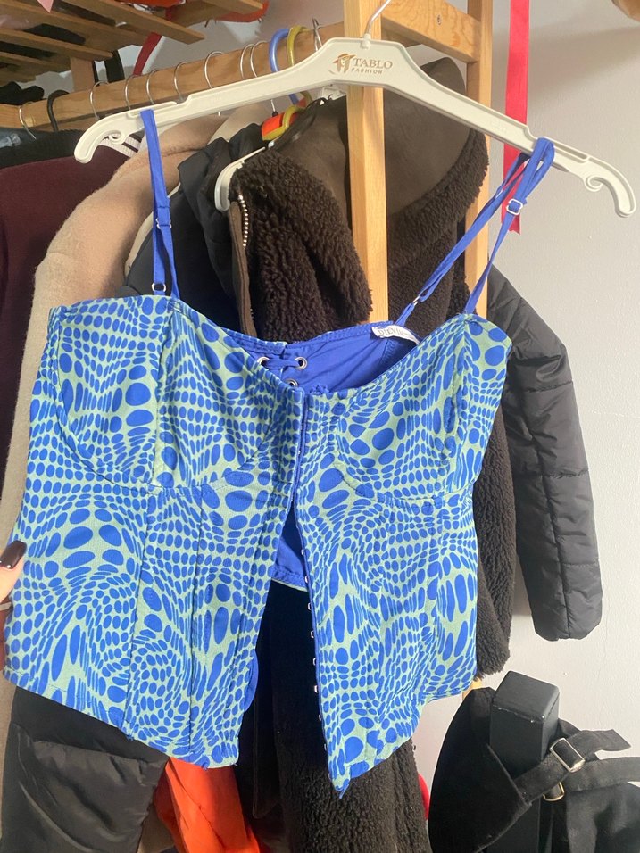 Mavi bağlama desenli, askılı ve straplez yakalı, fermuarlı, sentetik kumaştan yapılmış, günlük sokak modasına uygun dar kesim bustiyer.