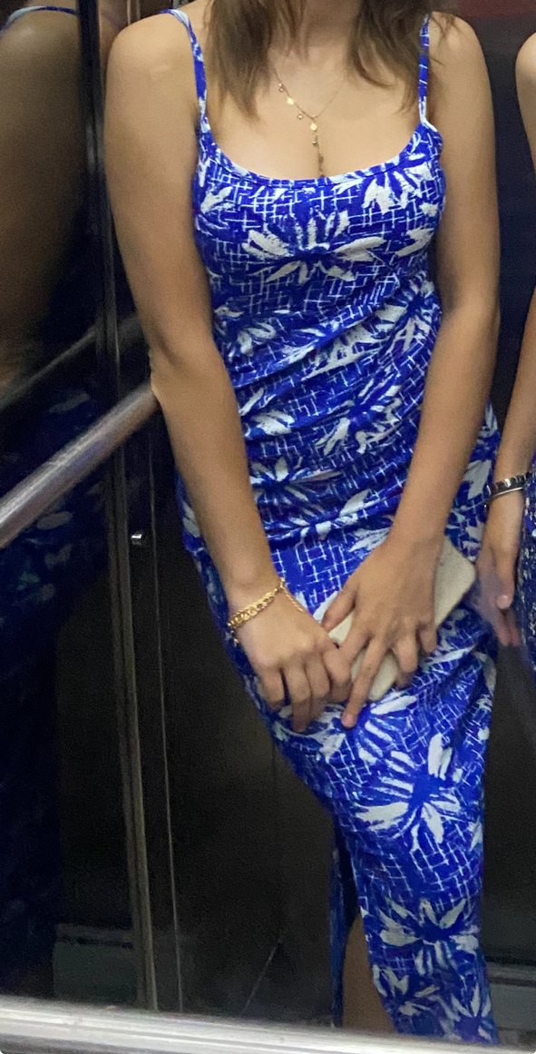 Mavi bağlama desenli, askılı uzun ve dar kesim elbise. Kayık yaka ve drapeli tasarımıyla günlük sokak stili için uygun.