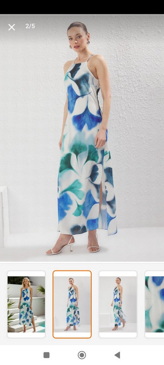 Askılı ve drapeli, bağlama desenli mavi uzun elbise, bol kesim ve sentetik kumaştan, düğünler için uygun. 1 kez giyildi