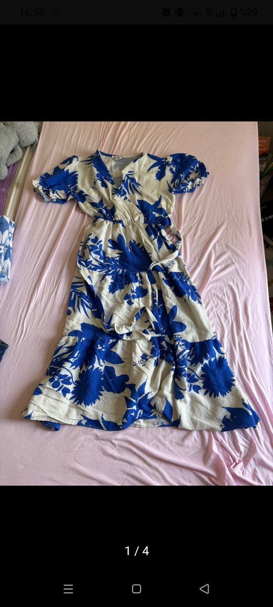 hafif tüylenme vardır S-M uyumludur.Mavi bağlama desenli, gevşek kesim, V yakalı uzun elbise. Kısa kollu ve drapeli, yumuşak sentetik kumaştan bohem tarzda.