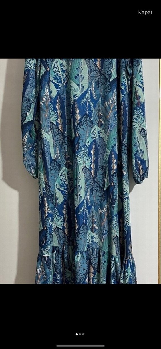 Uzun ve bol kesim bu elbise, yüksek yakalı ve uzun kolludur. Sentetik kumaştan yapılmış, koyu mavi bağlama desenli ve drapeli detaylara sahiptir, bohem stile uygundur.