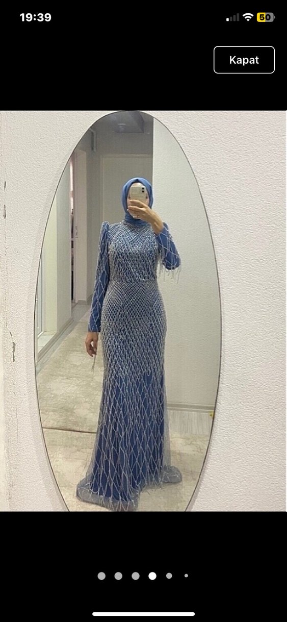 Satılık Mavi Desenli Uzun Drapeli Kadın Tesettür Abiye Elbise