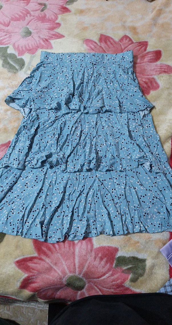 Pastel mavi bağlama desenli, volan detaylı uzun hamile eteği. Yumuşak sentetik kumaştan, bol kesim ve bohem tarzda, açık hava kullanımı için uygun.