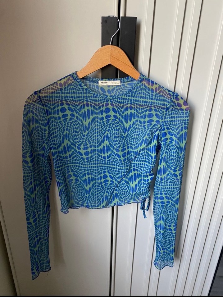 Mavi Bağlama Desenli Uzun Kollu Bluz