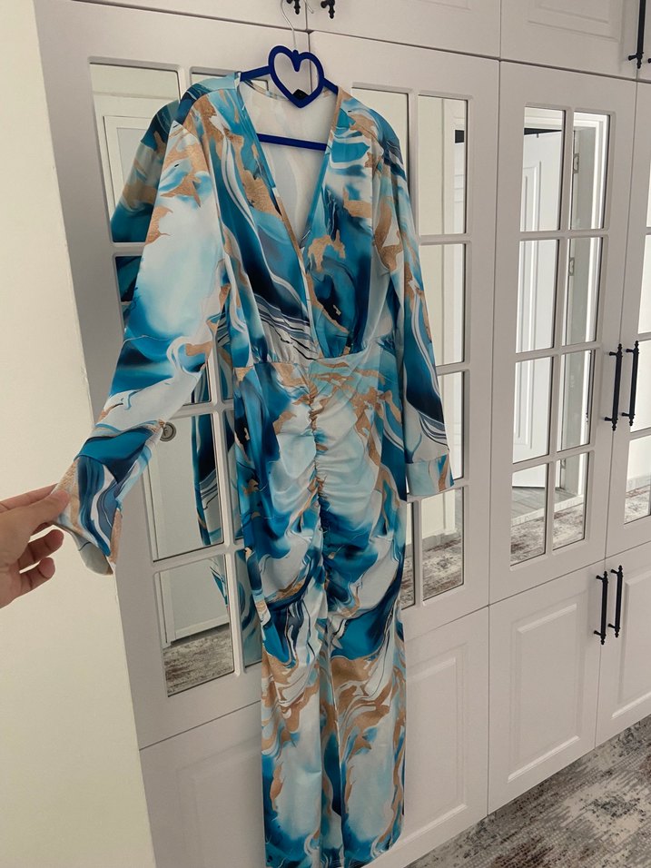 Mavi bağlama desenli, uzun kollu, V yakalı, drapeli ve vücuda oturan uzun elbisedir. Çağdaş ve avangard bir tarza sahiptir. Yeni hiç kullanılmadı