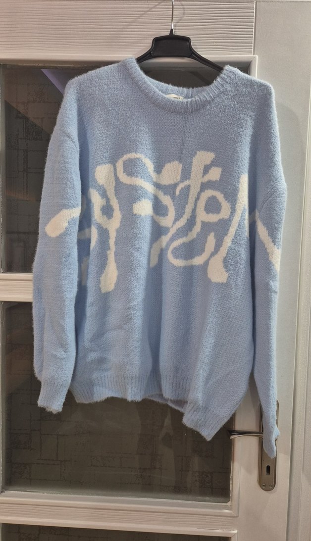 Pastel mavi renkli, bağlama desenli, uzun kollu, yuvarlak yakalı, rahat kesim erkek kazak. Günlük sokak stili için uygun, örme kumaştan yapılmıştır.