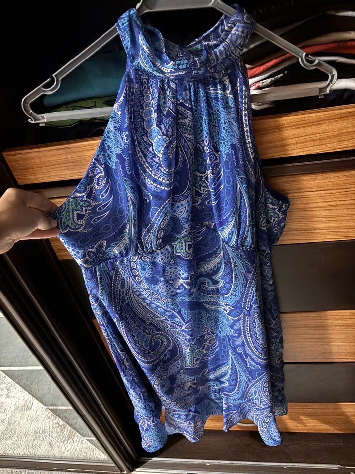 Mavi bağlama desenli, yüksek yakalı ve kolsuz bluz. İnce, parlak ve ipeksi kumaştan, bol kesim ve midi uzunlukta, bohem tarzına uygun.