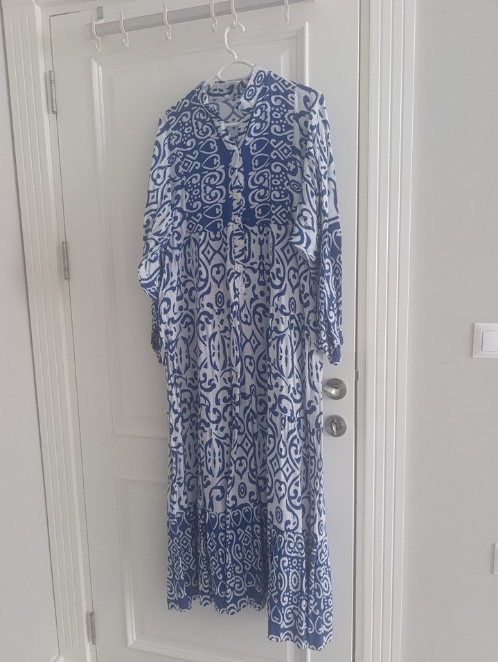 Mavi ve gri bağlamalı desenli, uzun kollu, V yakalı, püsküllü bol kesim uzun elbise. Günlük kullanıma uygun.