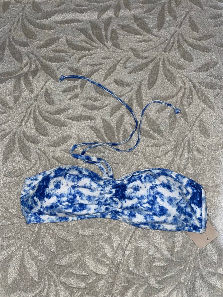 Mavi bağlamalı dantel detaylı, bağcıklı ve bağlamalı uzun kesim bikini üstü, bohem tarzda, dış mekan kullanımı için uygundur. Gri canlı tonlar içerir.