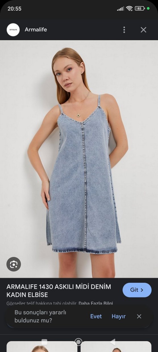 Bu açık mavi denim elbise, askılı ve V yakalı, bol kesim olup bağlamalı desenle rahat ve şık bir görünüm sunar.