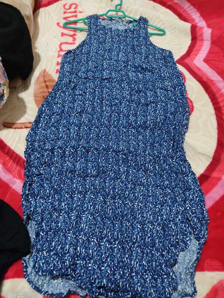 Mavi renkli, bağlamalı desenli, triko kumaştan yapılmış, uzun kesim, bohem tarzında, balıkçı yaka ve kolsuz hamile tunik. Rahat ve salaş kesimdir.