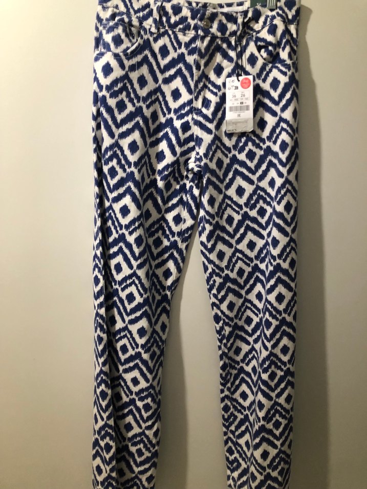 Bağlamalı desenli, mavi tonlarında, fermuarlı cepli, rahat kesim kadın pantolon. Sentetik kumaştan, bohem tarzına uygun günlük sokak giyimi için ideal.