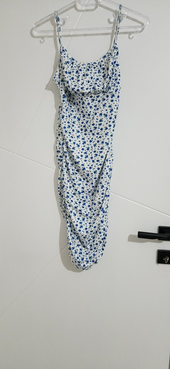 Uzun ve drapeli tasarıma sahip, açık mavi çiçekli desenli, vücuda oturan eteği, günlük sokak stiline uygun.