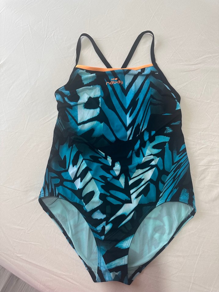 Bu kadın mayo, ince askılı ve bağlamalı, koyu mavi bağlamalı desene sahip, drapeli tasarımıyla plaj için uygundur.