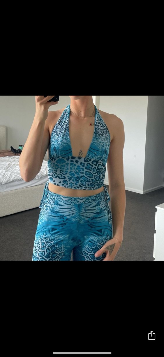 Mavi bağlamalı halter yaka, dantel detaylı, hafif sentetik kumaştan yapılmış, bağlama desenli midi uzunlukta atlet ve tayt takımı. ♀️
