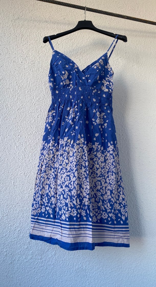 Pamuklu, mavi bağlamalı desenli, drapeli, askısız ve vücuda oturan midi uzunlukta bohem tarz elbise.