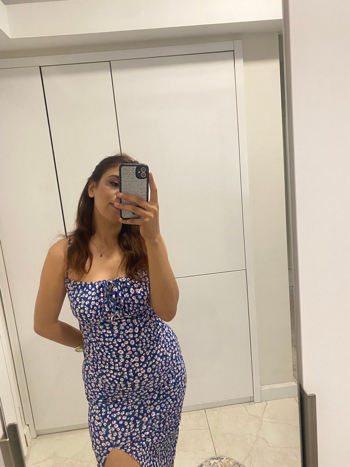 Bağlamalı midi boy, straplez yaka ve hafif mavi batik desenli yumuşak denim kumaştan üretilmiştir. Kolsuz tasarımı günlük kullanım için zahmetsiz şıklık sunar.