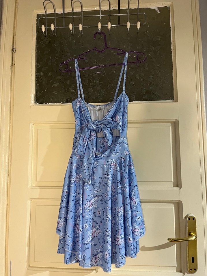 mavi pastel tonlu çiçek desenli mini elbise, göğsü bağlamalı detaylı