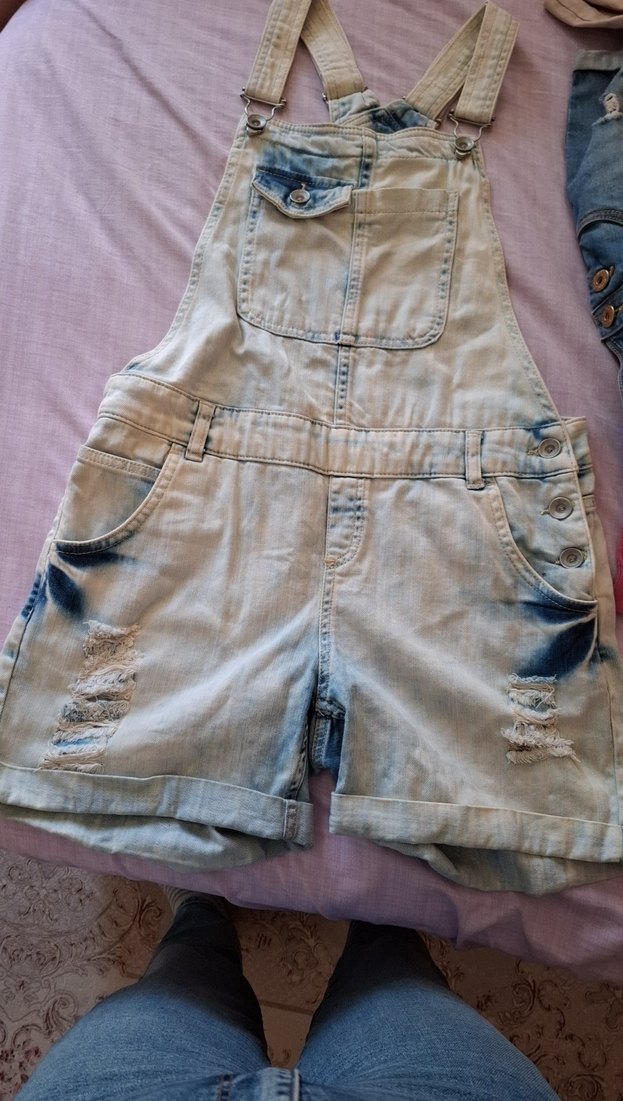 Bağlamalı ve düğmeli, gevşek kesim mavi kot mini tulum. Bağcıklı ve askısız tasarım, günlük rahat kullanım için uygundur.