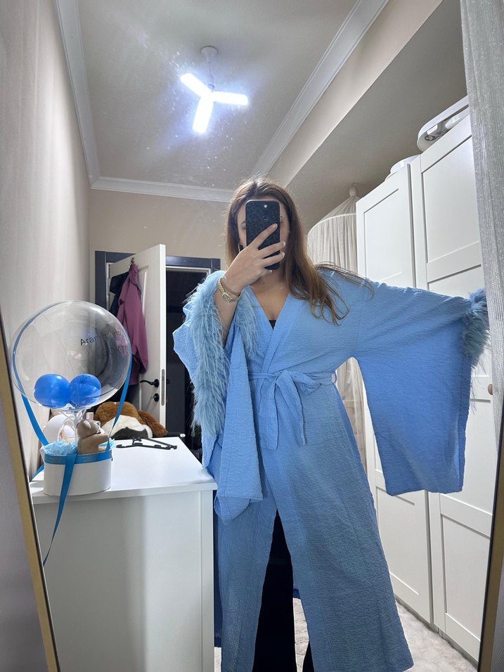 Pastel mavi bağlamalı, salaş kesim uzun kollu sabahlık, lohusa için uygun.