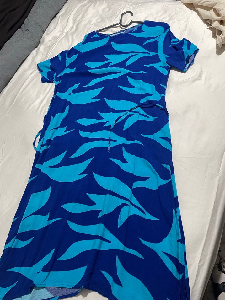 Boy 115 cm İki koltuk arası 60 cm Uzun, bol kesim mavi bağlamalı. Koyu mavi tie-dye desenli, kısa kollu ve sentetik kumaştan üretilmiştir.