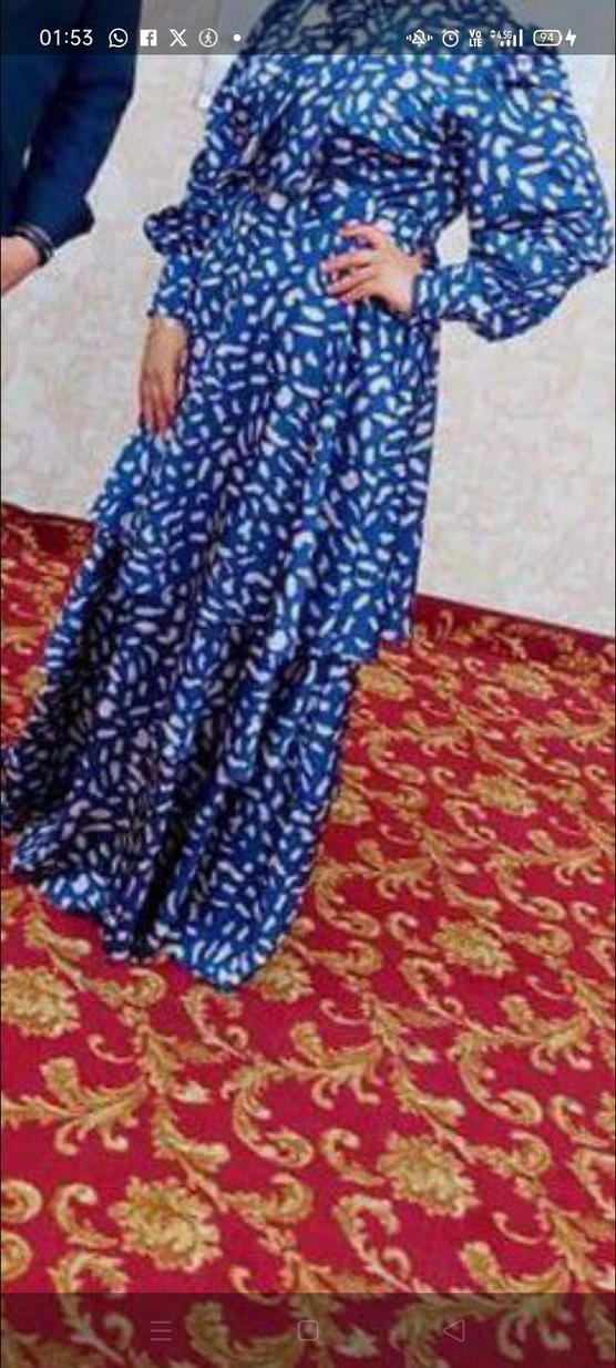 Uzun, mavi ve renkli bağlamalı desenli bohem elbise. Bol kesim, drapeli tasarım, tekne yaka ve uzun kolludur, sentetik kumaştan yapılmıştır.